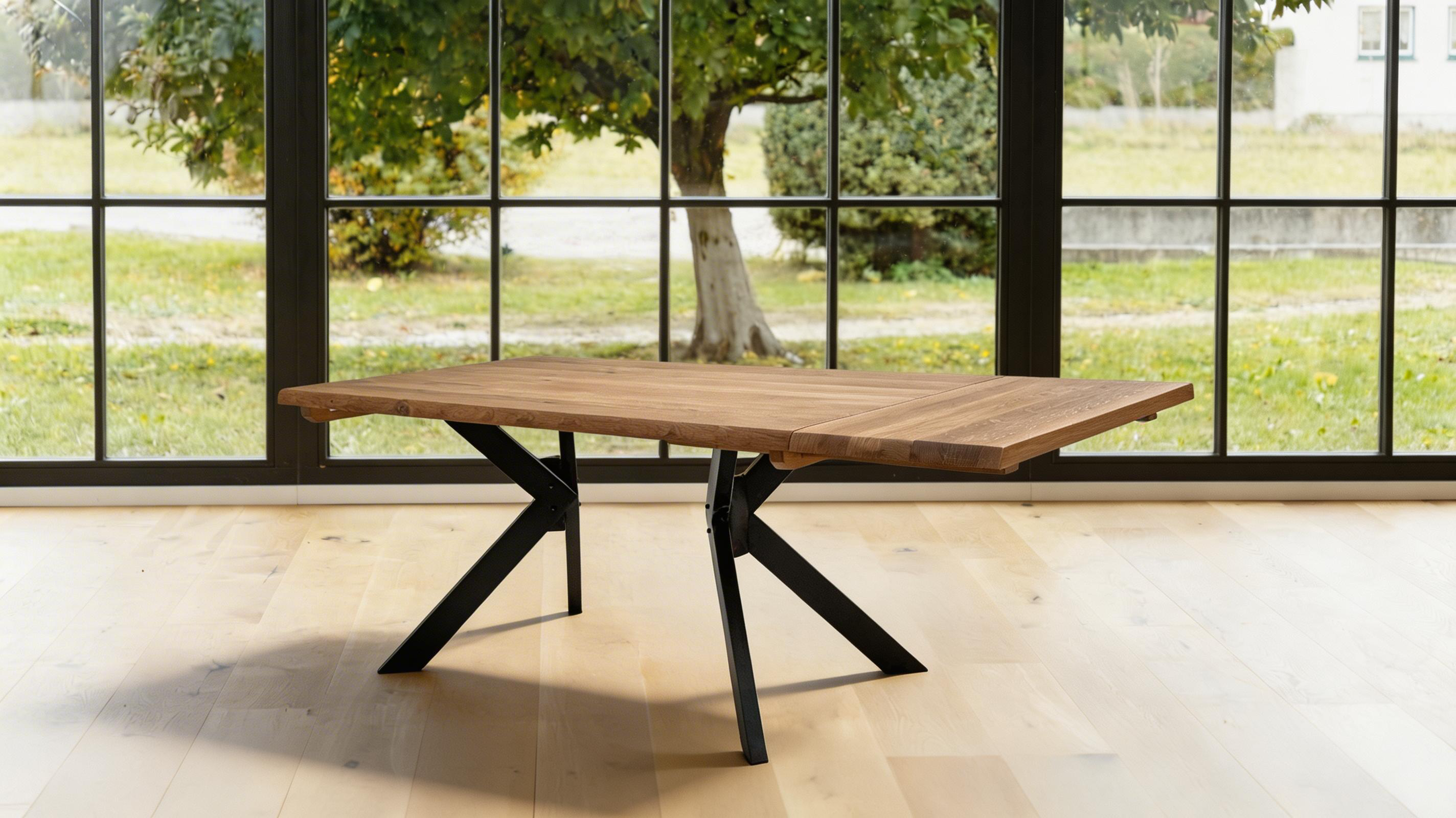 Massivholztisch mit schwarzem Spinnengestell